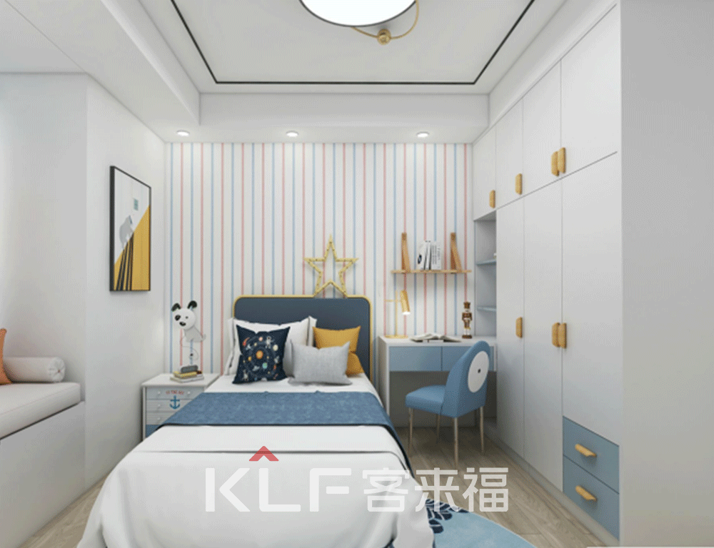 看完客厅往更深处来就是夫妻二人的主卧,以及儿童房了。主卧中冷色调以及暖色调的搭配,使得房间看起来更加温馨,因为房间内有一个大转角,所以我们用整体式衣柜设计,将这个转角藏了起来。但也因祸得福,让房间更具有空间的美感,同时还增加了收纳空间。儿童房的设计采用了简洁的童话风,让房间内的色彩更加丰富,活泼鲜艳。