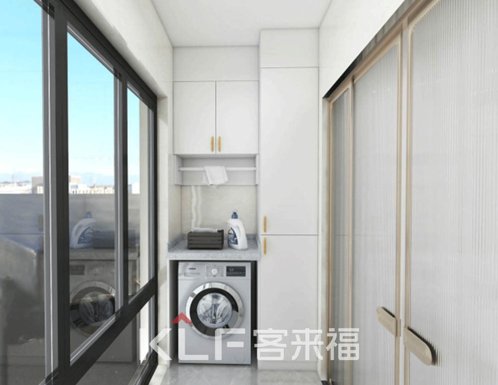 卧室的对面就是书房了,简单的设计,让书房看起来更加的安静,为屋主人营造出自己的一方小天地。再回过头来看到的就是阳台了,我们将洗衣机等物品设置在了阳台,使得洗衣晒衣更加的方便,同时也让千篇一律的阳台,变得更有自己的特色。
