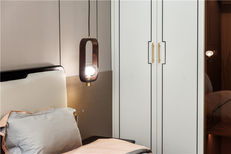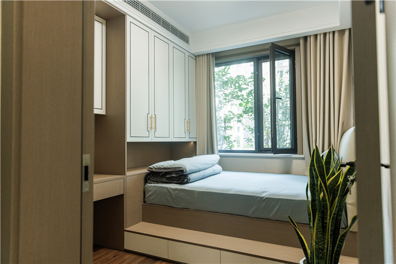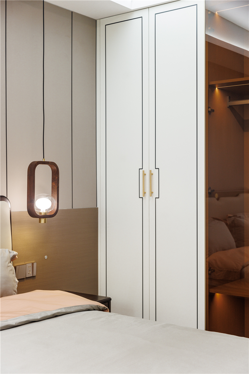主卧延续了餐边柜的配色设计,兰迪白与科技直纹的恰到好处融合,充分发挥新中式的淡雅魅力。