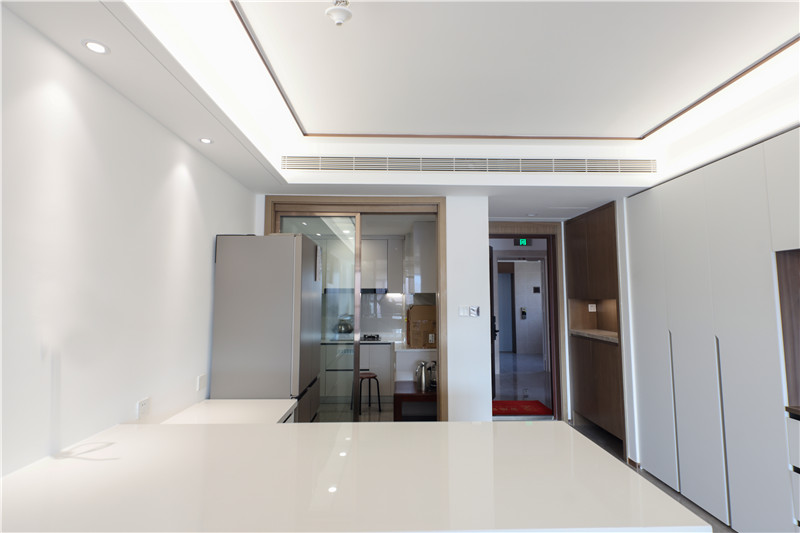 厨房贴墙而建呈小U字型构造,无拉手设计使得整体视觉清新,简单几平米的烹饪区,动线明晰、存储在线。
