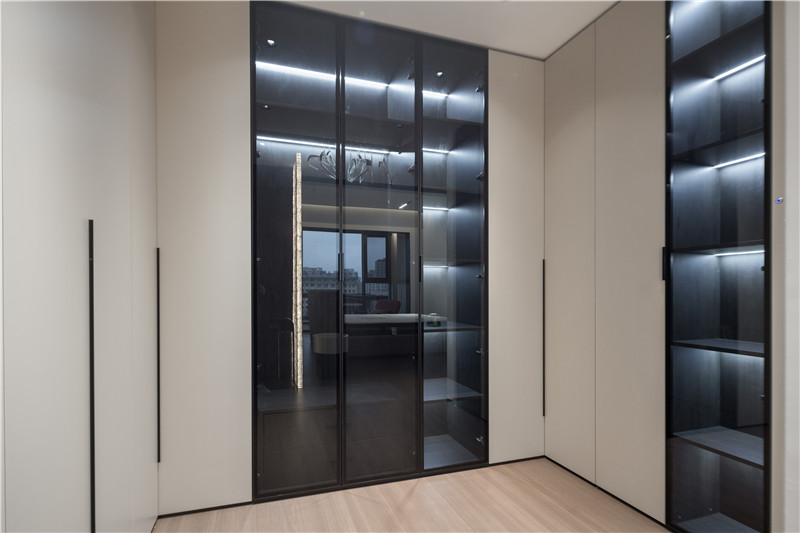 室内以梦幻玻璃砖隔出一个衣帽间,梳妆台依屋主需求定制高度,侧边U型立柜作为收纳区,展示区与私密区区分,符合人体工程学设计。