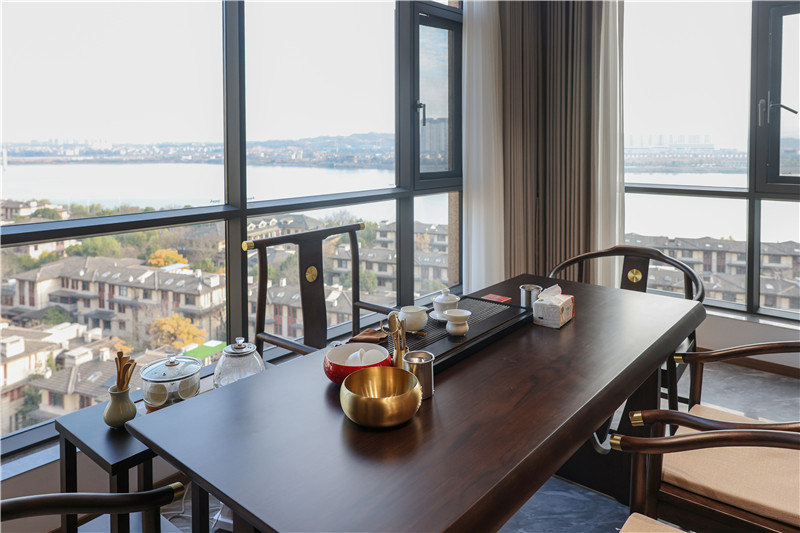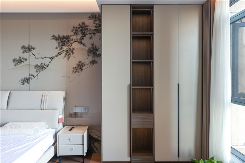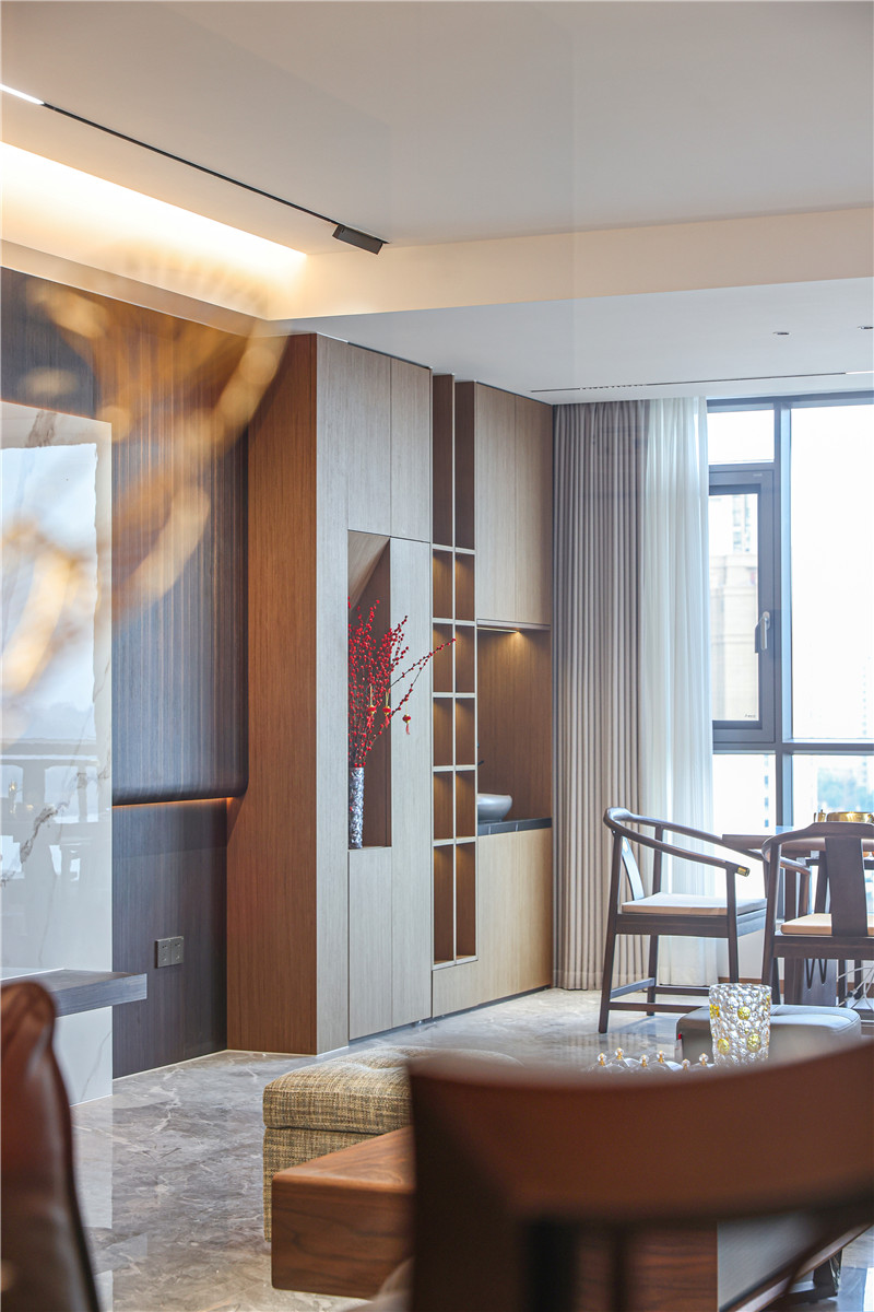 一侧柜体为挂衣存储区,无拉手柜门协调视觉、休憩座缓解疲劳,背板加入中国结屏风隔断,中式意境突显。