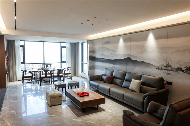 沙发背景墙采用整面水墨画,其边侧以圆弧收边,方圆间显古雅风韵。