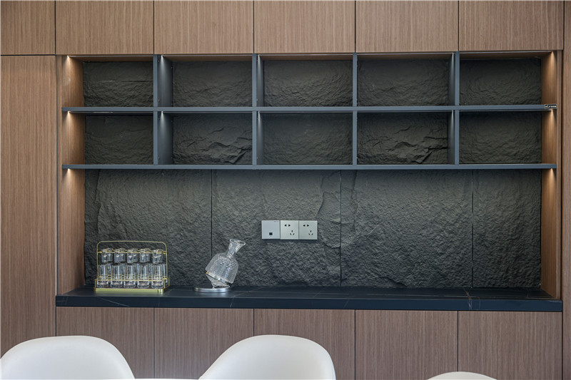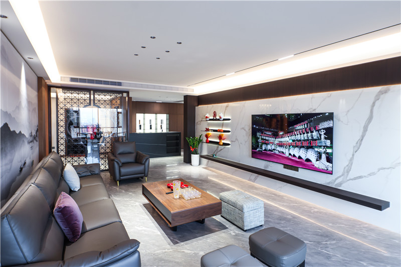 电视背景墙内里整面木材拼接整块大理石板,彰显层次感;背景墙外嵌铝板及整面木板,发挥收纳桌及展示柜效用。