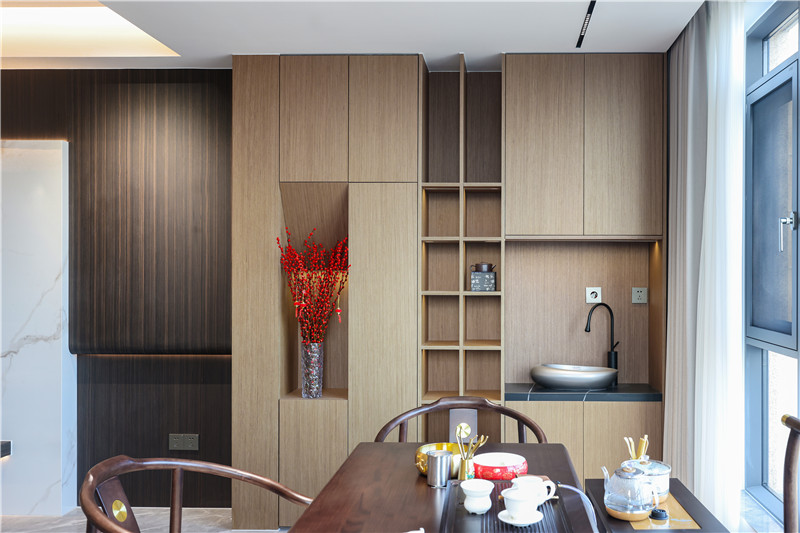 中西结合式餐厨空间,其餐厨背景墙整面柜体嵌入开放格,可做展示柜、酒柜使用。