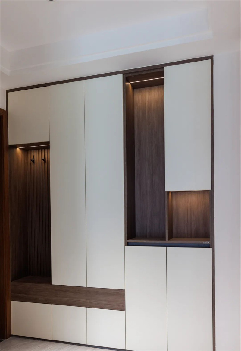 柜子设计:玄关柜一柜到顶既满足收纳需求,顶部空间也不用再打扫;功能分区:利用深色穿插设计,将挂衣区与放鞋区隔开;封闭式与开放式挂衣、封闭式放鞋区更符合日常使用习惯。