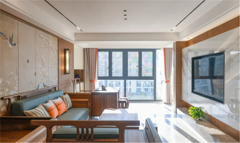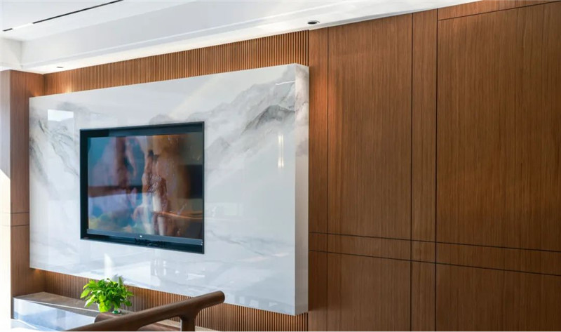 实木格栅、不规则拼接与悬浮山纹大理石构建成电视背景墙,画面观感令人舒适,古色古香;背景墙内含隐形门,巧妙的设计使空间显大,和谐美观。