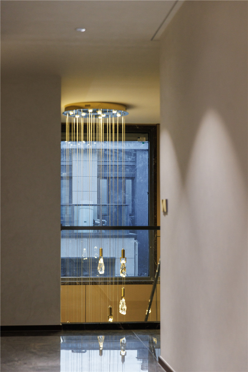 梯座上方设置休息区,谈心、小聚可在这里实现;背侧做狭长展示柜,夹丝玻璃、内嵌灯带,颜值UP!