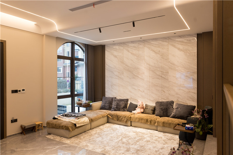 客厅无主灯设计让空间更加宽阔明亮;悬浮大理石电视背景墙灵动不沉闷,背后满墙的格栅设计增加舒适感,缓和轻奢风带来的疏离,让空间更加和谐宜居。