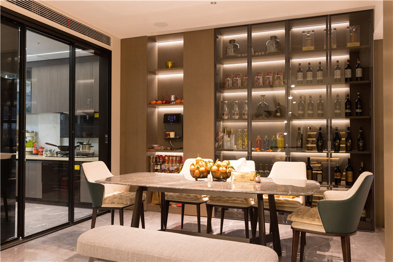 餐厅整体风格与客厅一致,暖黄灯光下尽显奢华氛围。餐边柜选用透明玻璃柜门,在内置灯带照射下,奢享优雅。