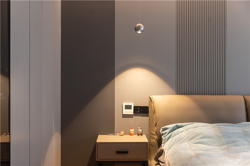 卧室设计整体风格温馨舒适,空间色系更加温和;无主灯设计使得屋内简约开阔;床头背景墙拼接+格栅,时尚又充满设计感。