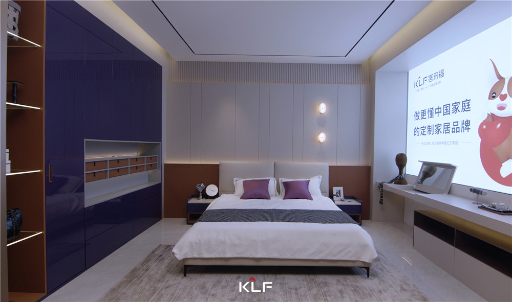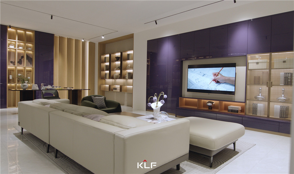 客厅采用围合式布局,一侧墙壁做镜面处理,与柜体进行模块化组合;矩阵成型的柜体紫棠色映入眼帘,活泼且高级;烤漆门板顺滑且颇赋光泽感,展现出米兰·(milan)的创意工艺。