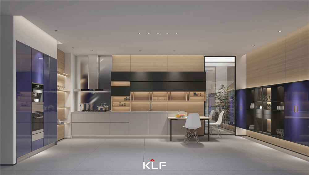 厨房以U型设计呈现,丰富的收纳空间还原了日常干净整洁的居家环境;科技橡木搭配魔力黑、紫棠色也更儒雅,地柜空间采用茶白,视觉上更显清爽;厨房在收纳抽屉上运用了新款的上翻电动灵云展、电动上翻折叠门等科技。