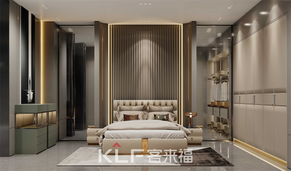 作为修养身心的家庭空间,墨奈系列卧室背景采用莫兰迪水漆波浪板,造型低调又不失活泼,完美呈现出温馨氛围。搭配上意大利铝包边的大地色皮革门,彰显出轻奢的生活态度,奢而不华,重在细节。